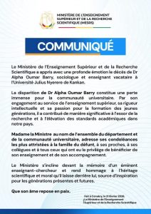 Le Ministère de l’Enseignement Supérieur, de la Recherche Scientifique et de l’Innovation (MESRS) a publié un communiqué officiel suite au décès de Dr Alpha Oumar Barry, sociologue et enseignant vacataire à l’Université Julius Nyerere de Kankan.