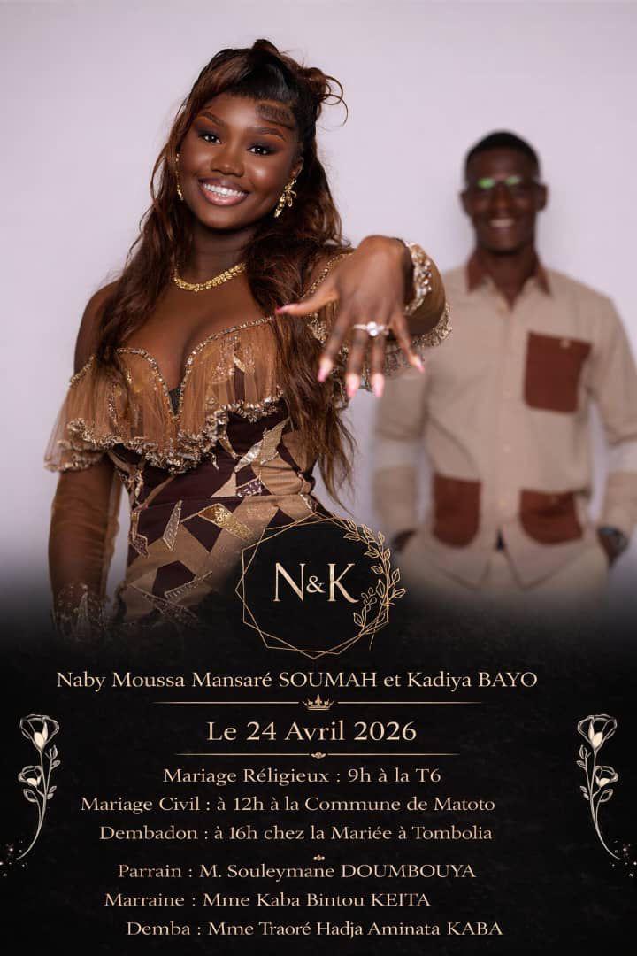 Le journaliste guinéen Naby Moussa Mansaré Soumah s’apprête à franchir une nouvelle étape importante de sa vie. Il unira sa destinée à celle de Kadiya Bayo à l’occasion d’une cérémonie de mariage prévue le 24 avril 2026, dans une atmosphère qui s’annonce à la fois solennelle et conviviale.